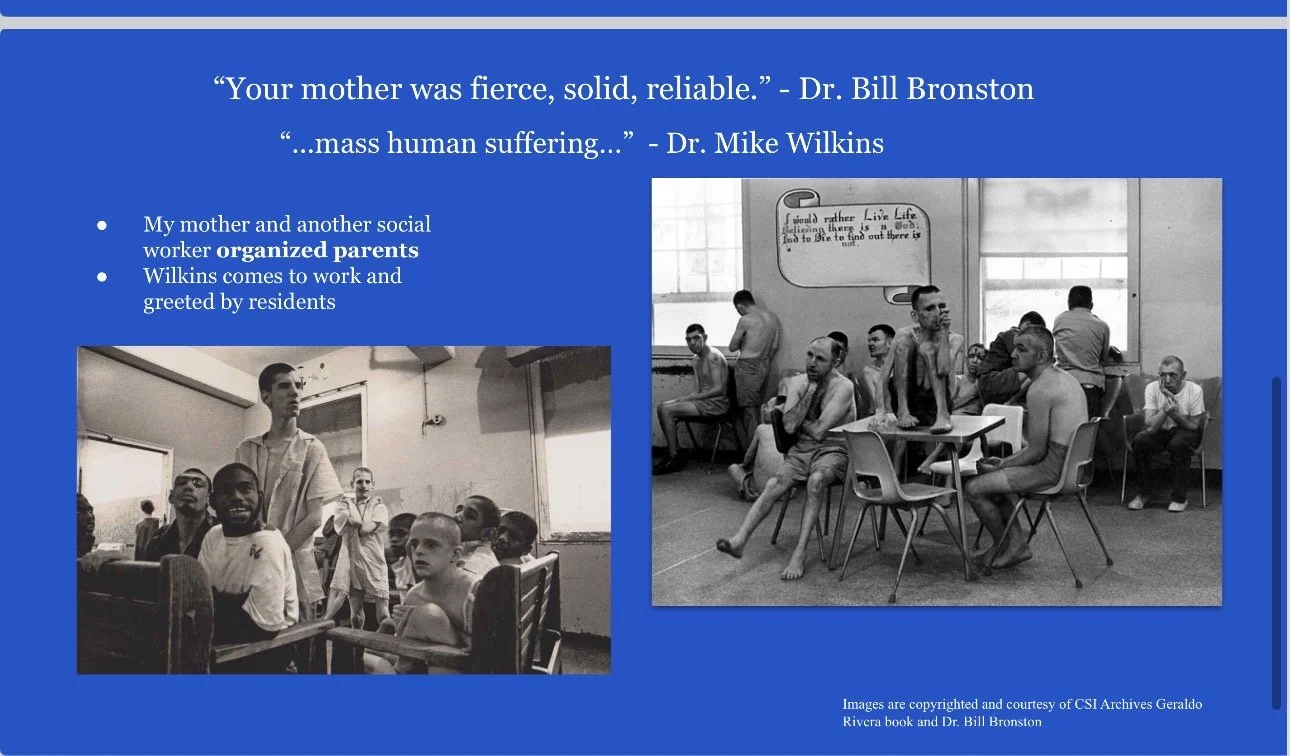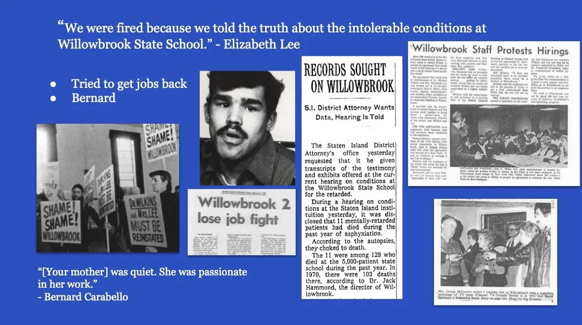 Whistleblowing: Jennifer shares the story of her mother and grandmother and the closing of Willowbrook State School on Staten Island, New York. Elizabeth Lee was a social worker in the early 1970s at Willowbrook and was fired for her whistleblowing and parent organizing that revealed the abuses at Willowbrook. A young Geraldo Rivera covered the story after Elizabeth and others went to the Staten Island Advance with the information. The Staten Island Advance broke the story. Deinstitutionalization and IDEA followed.
